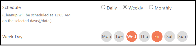 Weekly: Select this option to schedule the Access Devices cleanup weekly. For example, in the image below, the cleanup is scheduled to run every Wednesday and Friday at 12:05 AM.