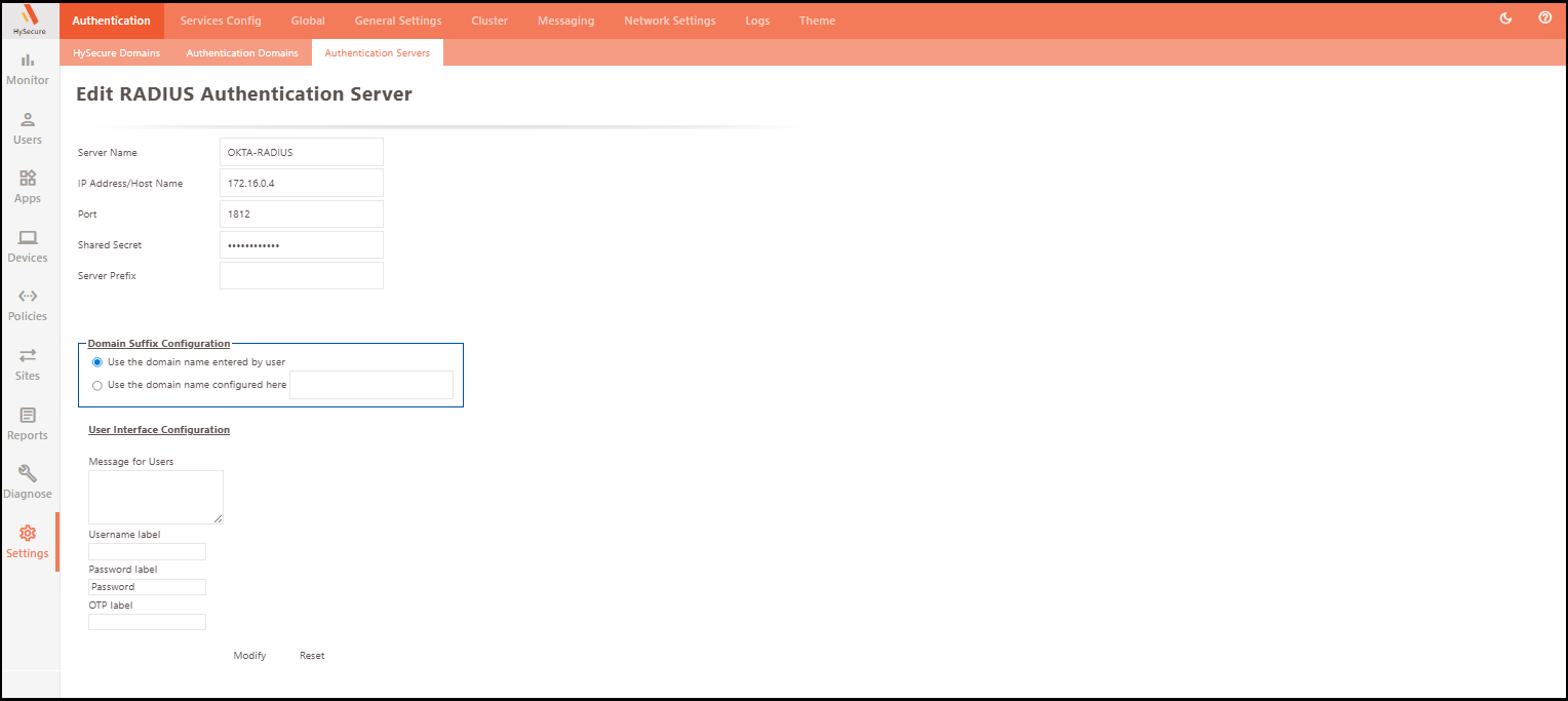 b. The HySecure Gateway is configured as a RADIUS client, and the details of the Okta RADIUS Agent server are stored in its configuration.