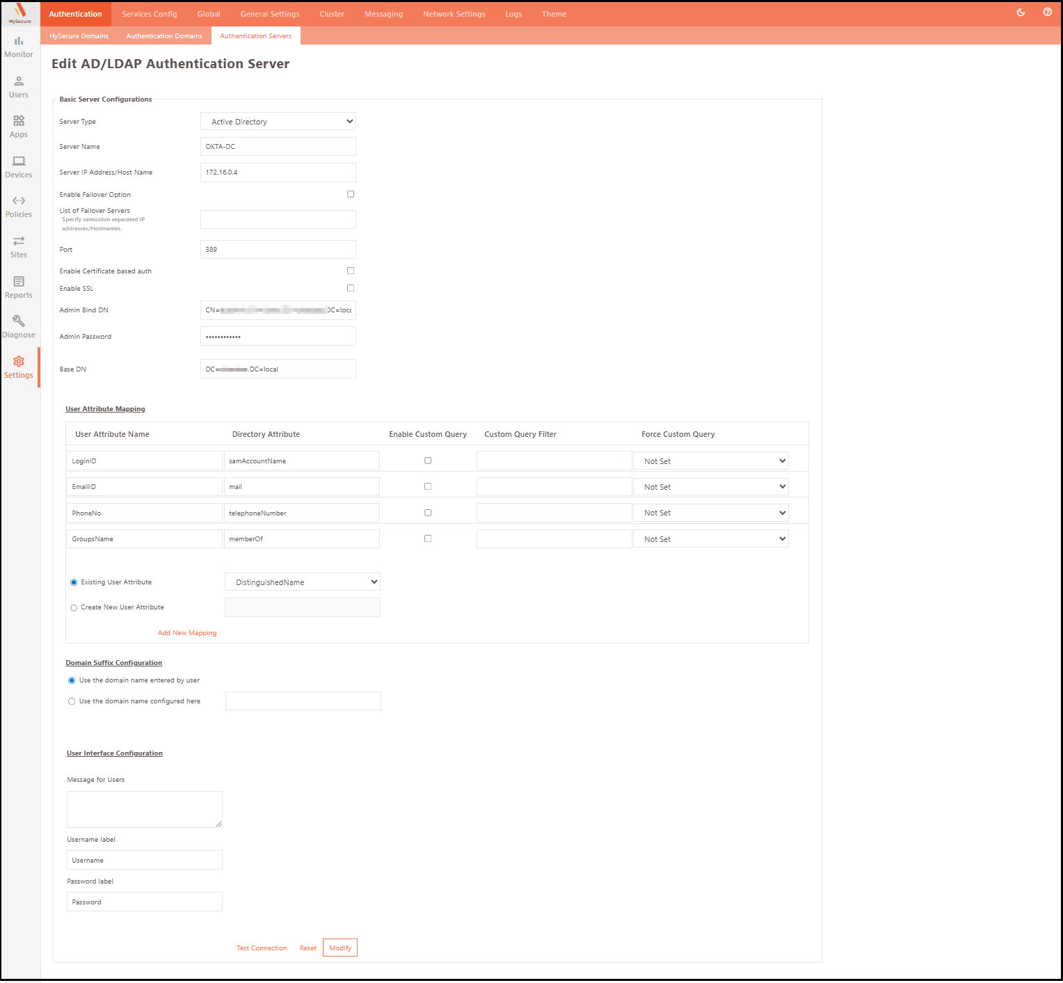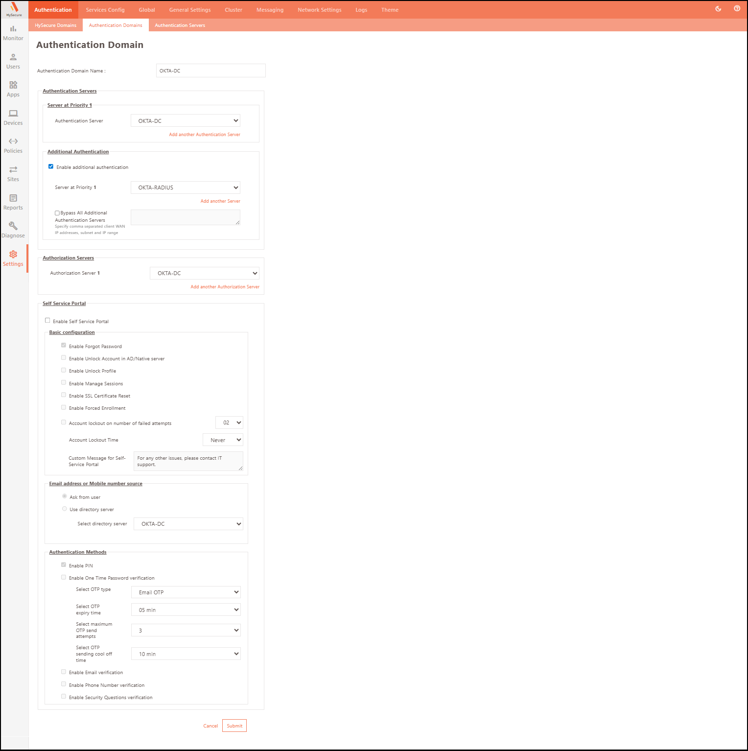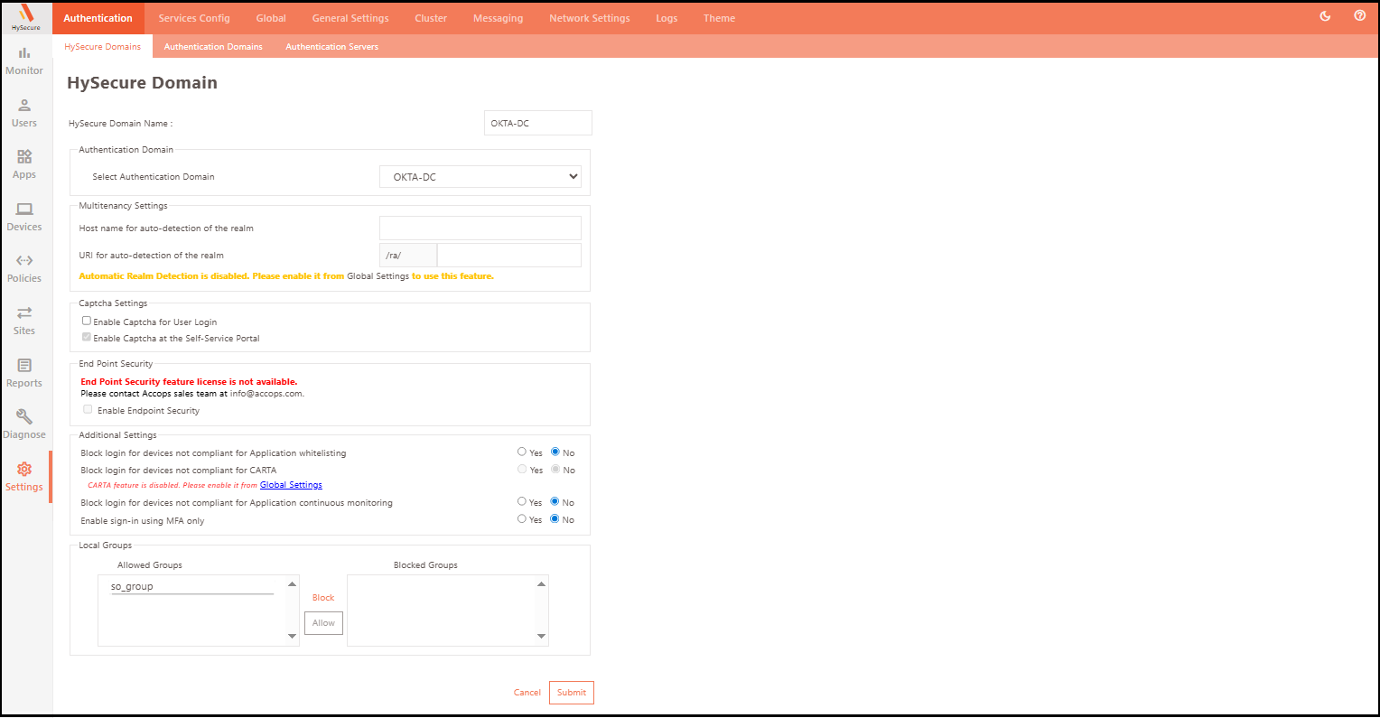 - Add a new HySecure Domain and select the respective Authentication Domain (Okta) under the Select Authentication Domain field.