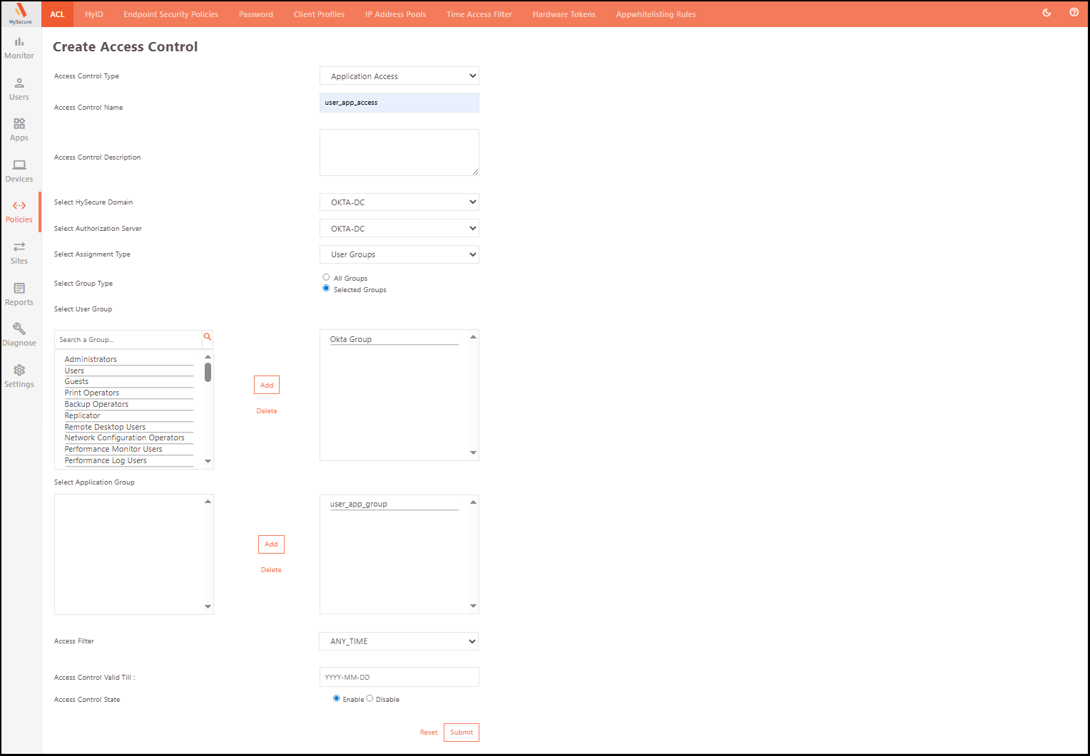 Create an ACL policy and configure it with the authentication Server and the respective application group.