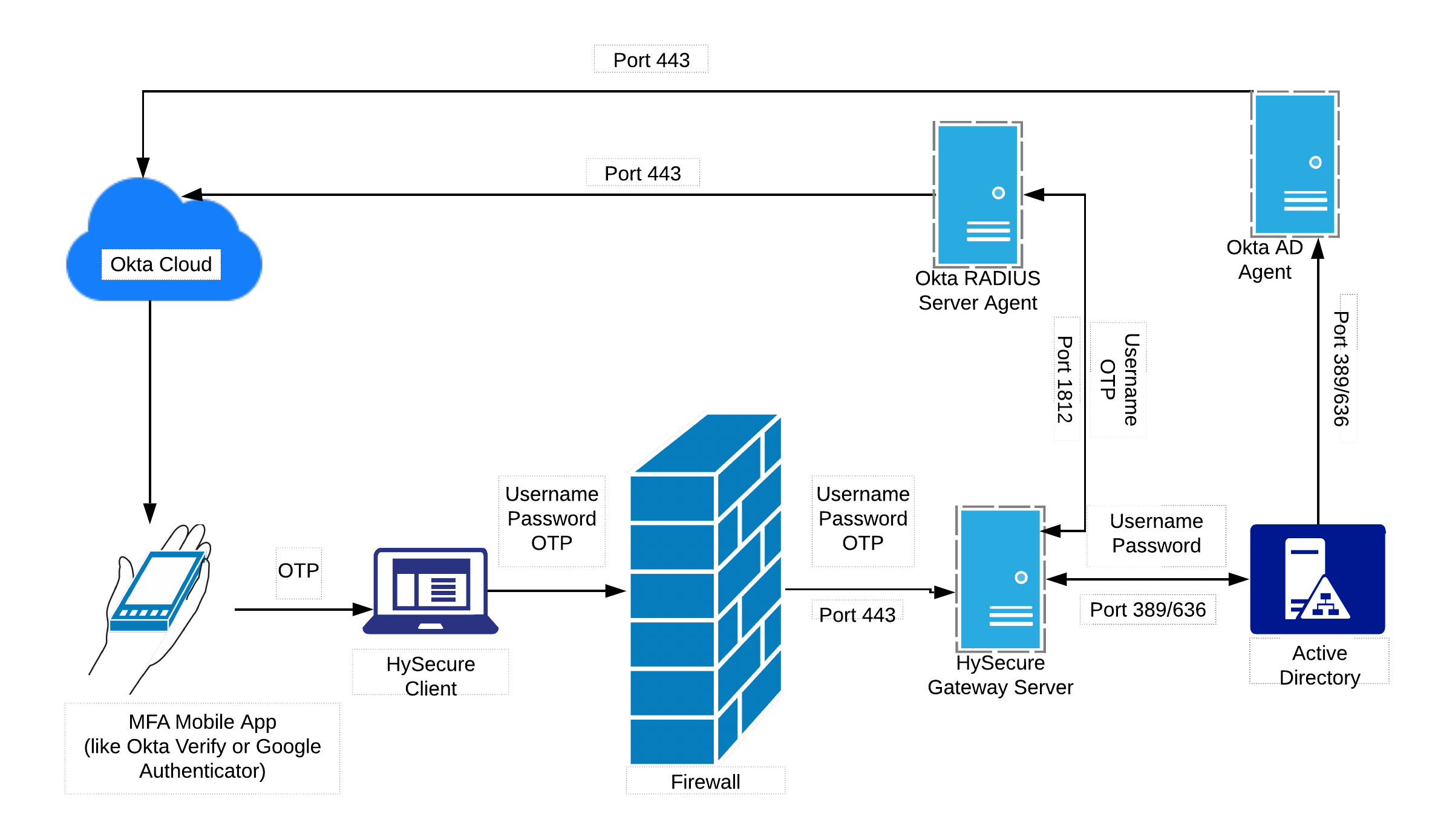 a. The user enters the username, AD password, and the OTP generated by their MFA application configured in Okta (e.g., Okta Verify, Google Authenticator) into the HySecure client.