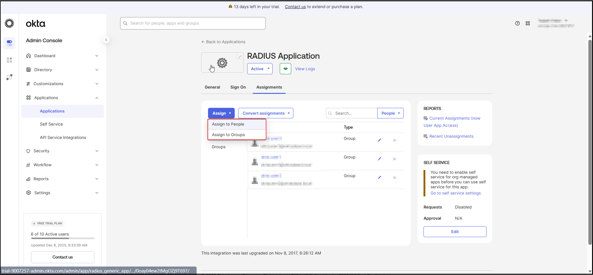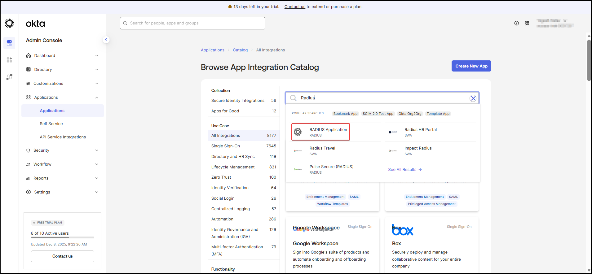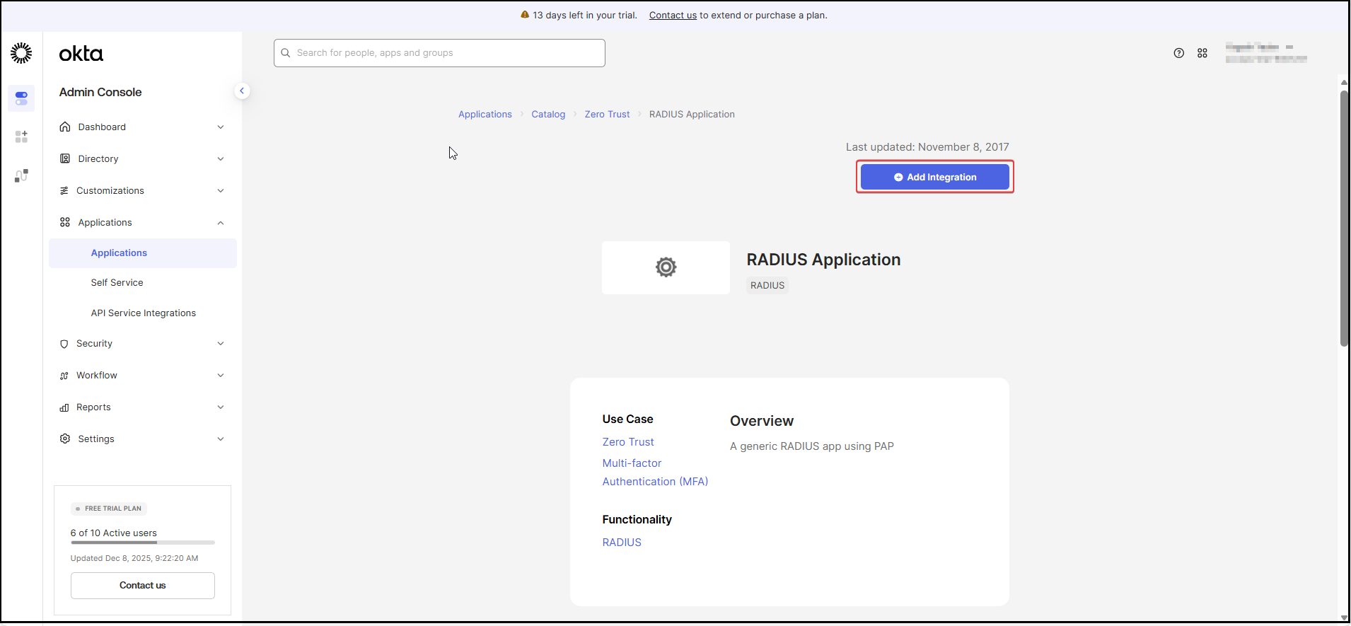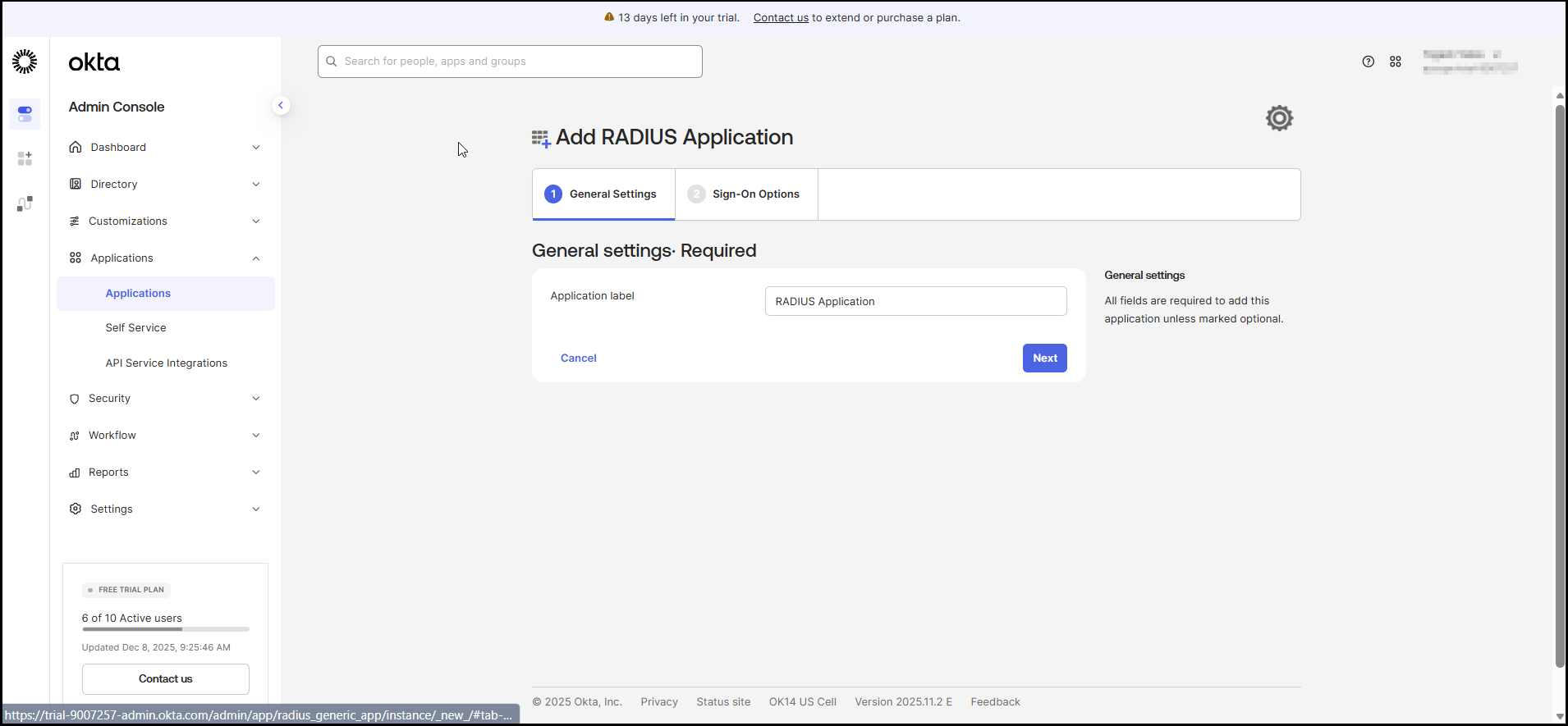 An Okta application must be created to enable and configure the Okta RADIUS Agent.