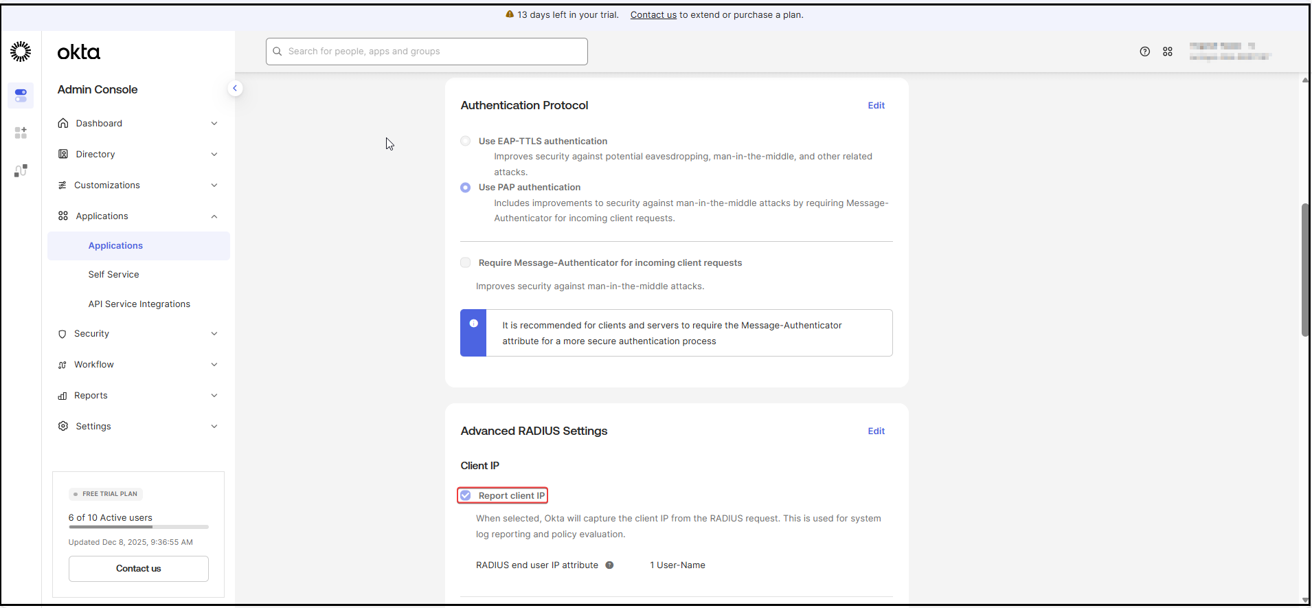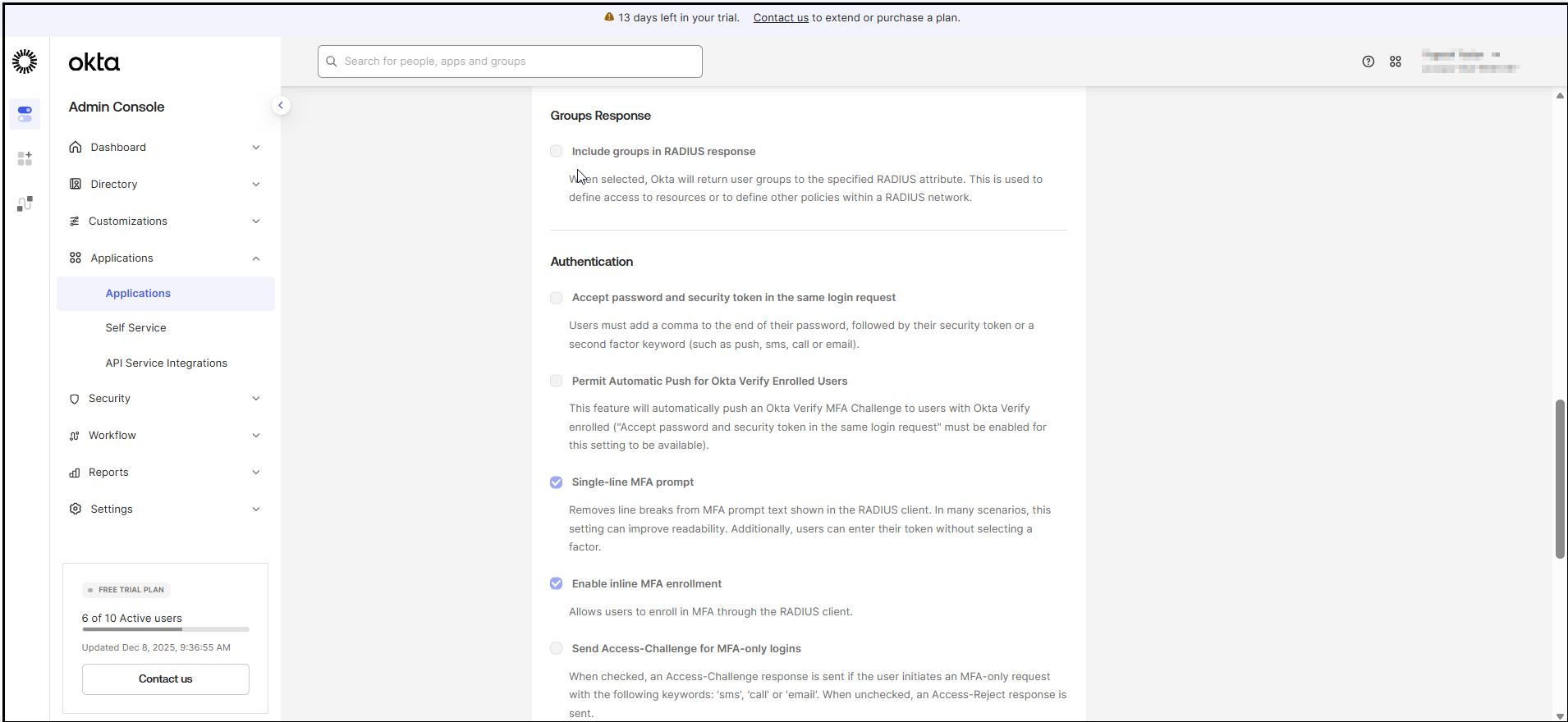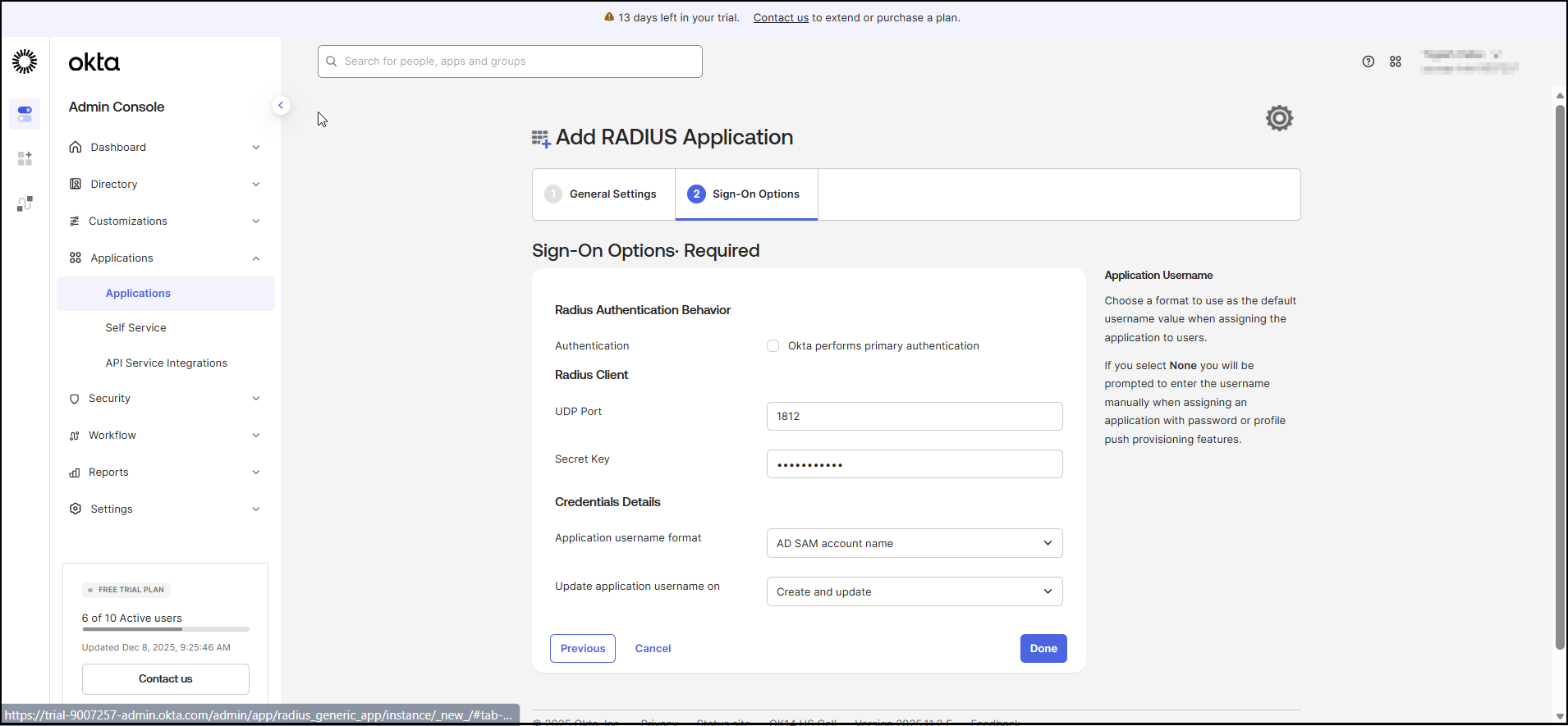 Field Example Authentication - Okta performs primary authentication Keep this option Unchecked UDP Port Enter 1812 Secret Key Enter the {secret-key} Under Credential Details > Application username format Select the AD SAM account name Under Credential Details > Update application username on Create and update