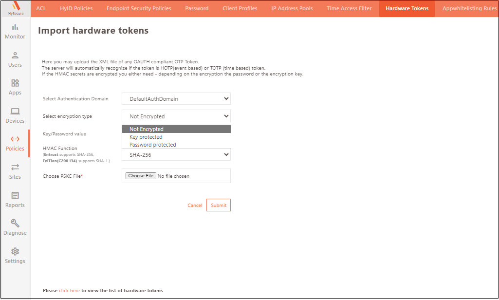 | Select Authentication Domain | Select the Authentication Domain for which the Hardware tokens are to be imported. |
