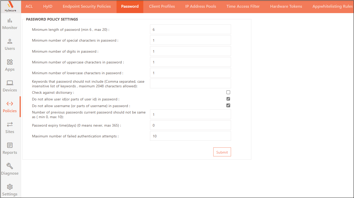 Navigate to Policies > Password.