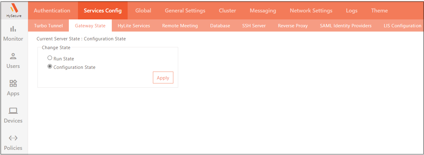 Navigate to Settings > Services Config > Gateway State and change HySecure gateway State to Configuration State.