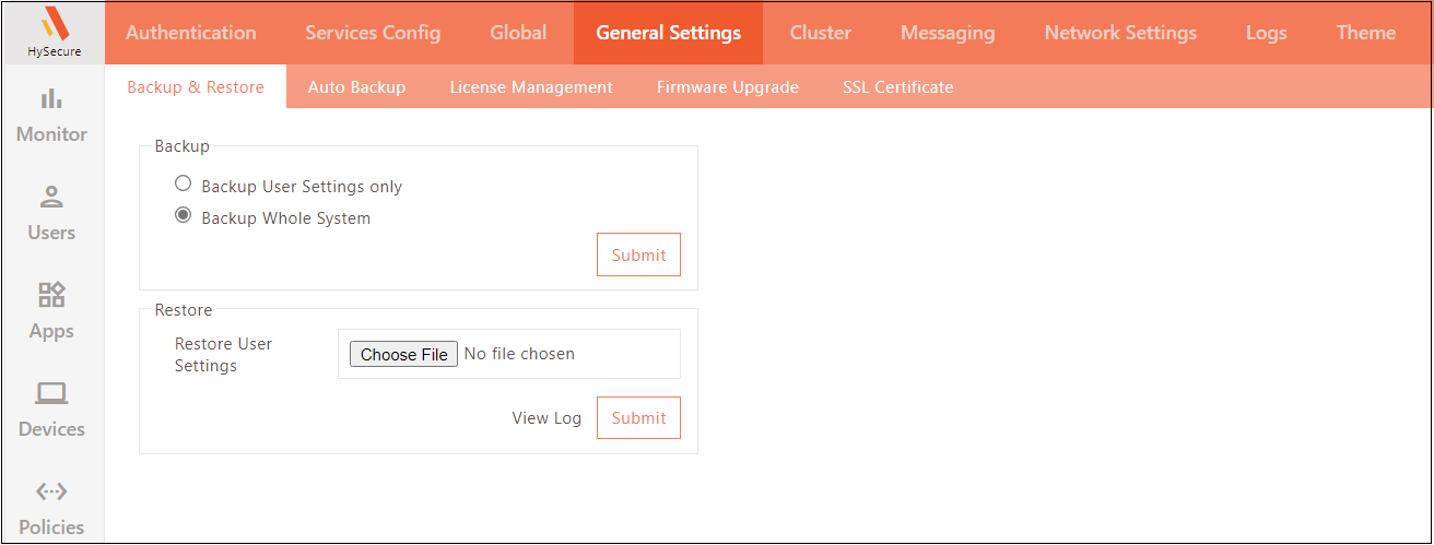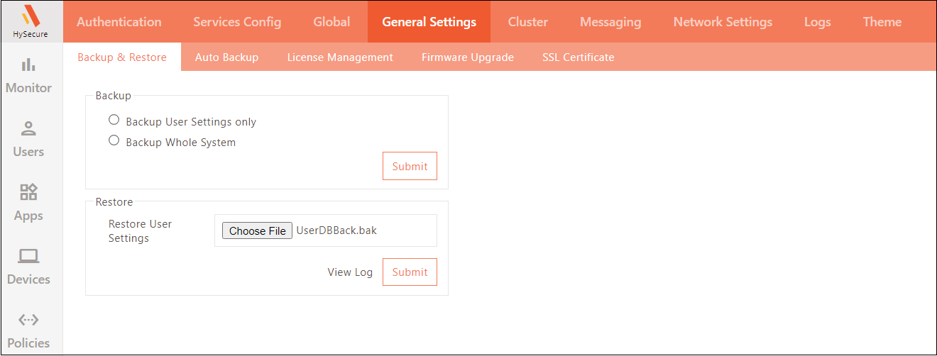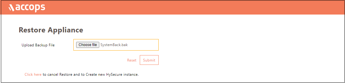 Browse and Upload the backup file and click Submit. HySecure gateway will be restored to the backed-up state.