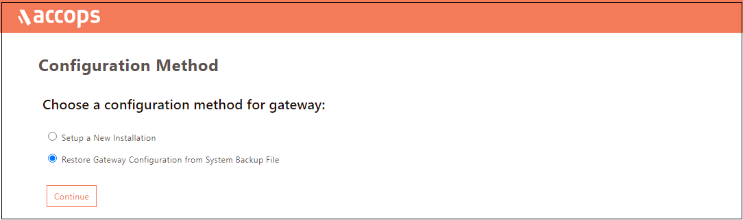 At the time of preboot, select the option Restore Gateway configuration from System Backup File and click Continue.