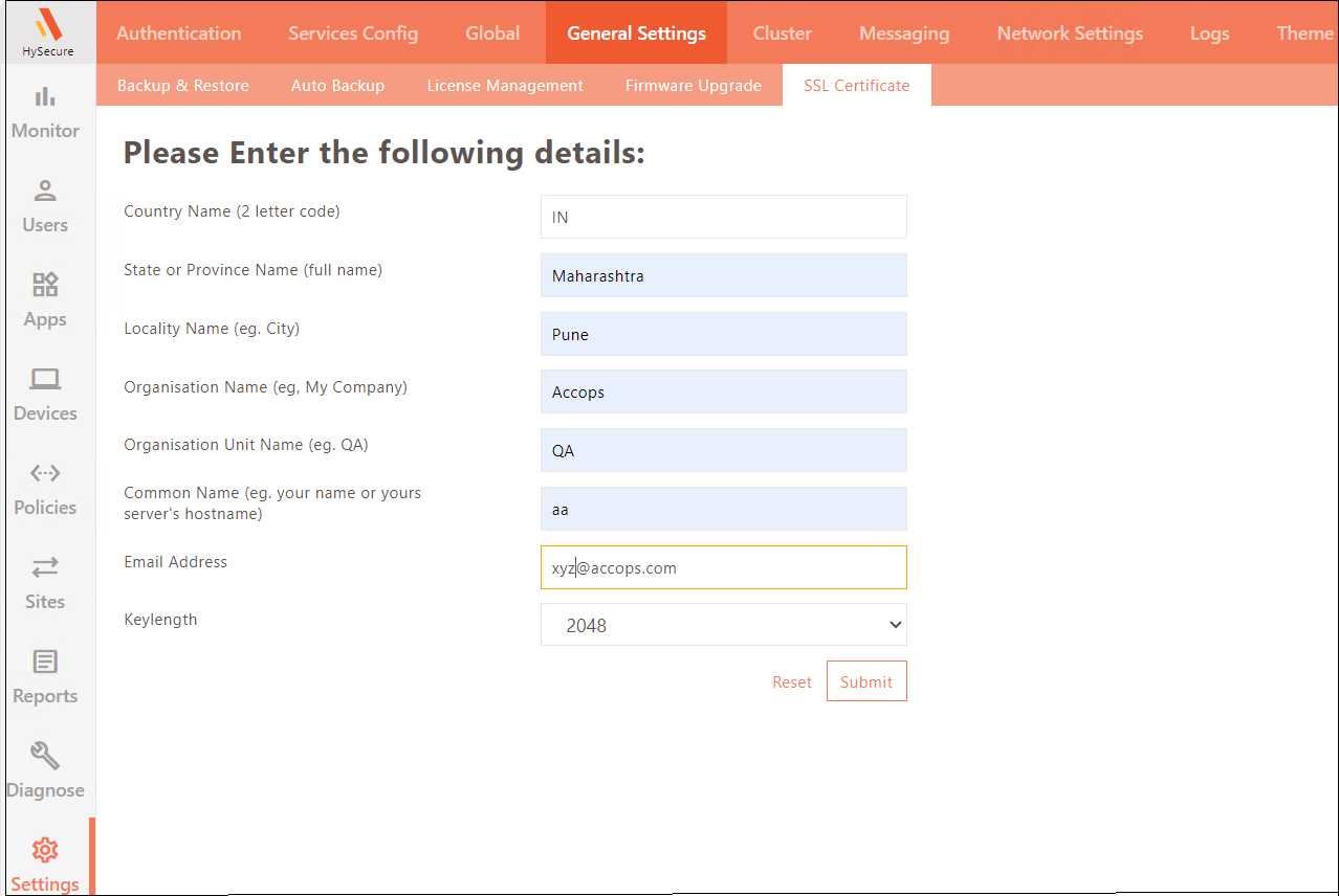 Field Description Country Name Enter the 2-letter code for the country name e.g. for India - IN. State or Province Name Enter the complete state or province name. Locality Name Enter the locality or city name. Organization Name Enter the name of the organization of the CSR Client. Organization Unit Name Enter the department name of the organization. Common Name Enter your name or the server hostname. Email Address Enter your complete email address. Key Length Select the length of the key to be generated. The larger the key, the stronger the encryption will be, but it will take more processing time. -