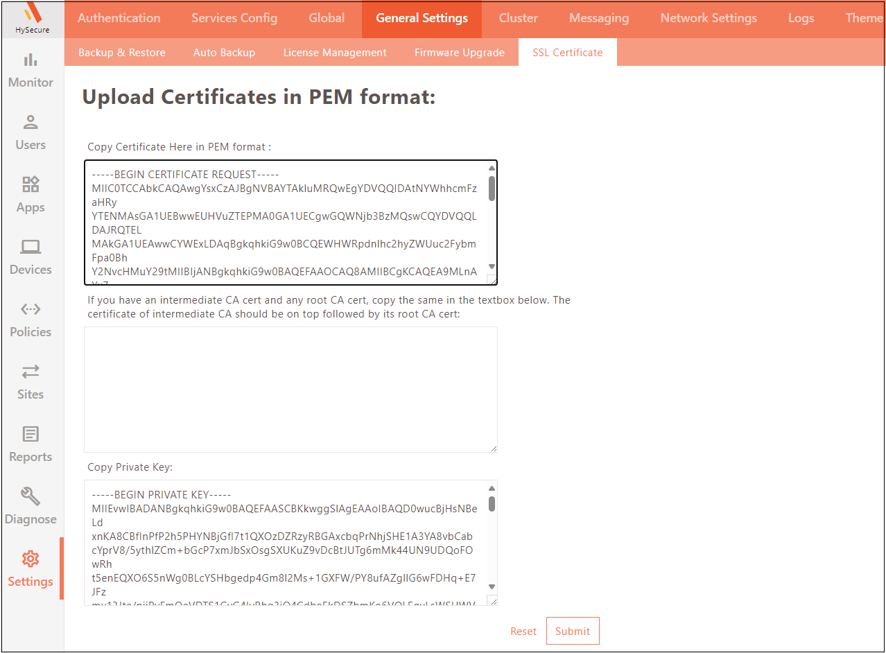 - Upload private key & Certificates in PEM format: The private key gets generated during CSR creation, and all Certificates are received from the CA, in PEM format.