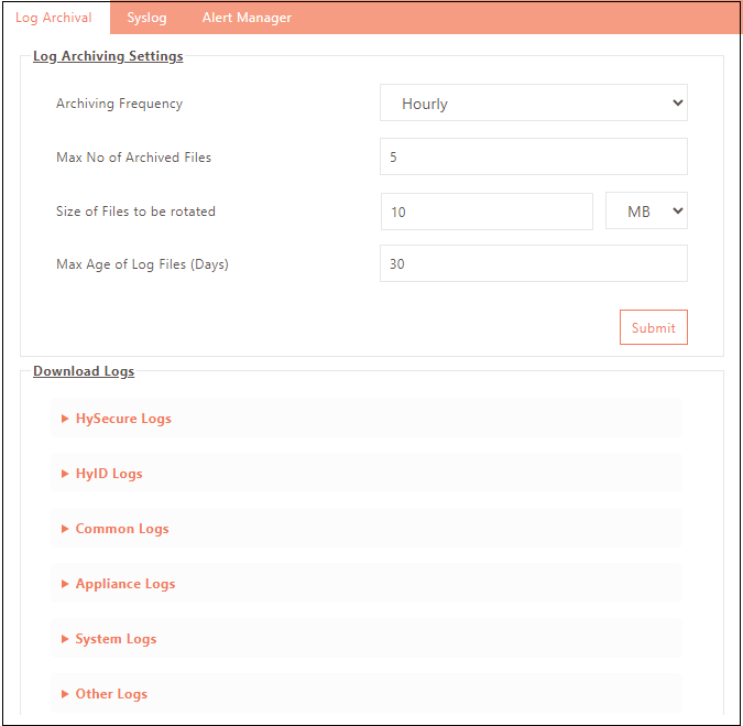 HySecure Gateway performs logging of various kinds of logs like HySecure logs, Appliance logs, User logs, Admin logs, EPS logs, etc. The log files get archived on the device itself as per the Log Archiving Process.