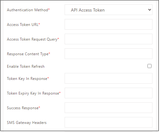 | Access Token URL | Enter the Access Token API URL to fetch the Access Token. It validates the user on the SMS vendor's side, and if successful, the SMS is sent; otherwise, the request is rejected. |