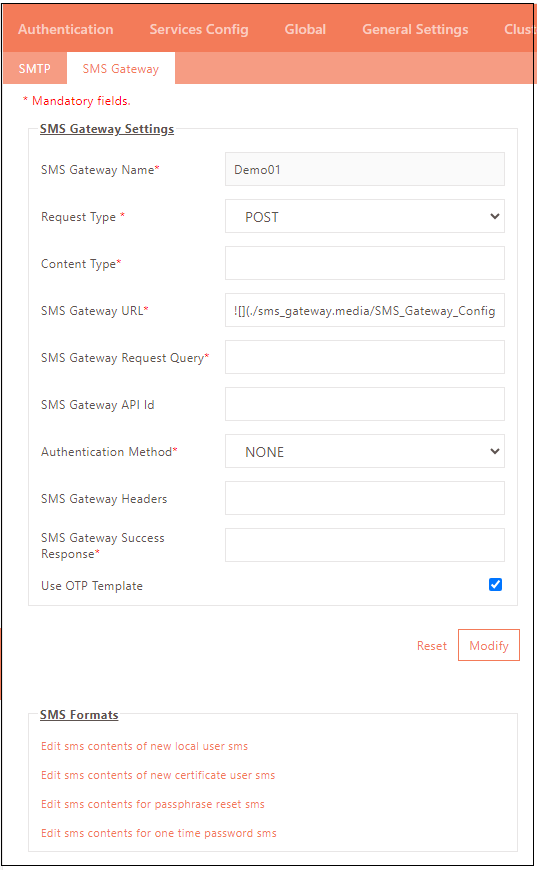 An API document from the SMS Gateway Service provider should be available to configure the SMS Gateway. The API document is expected to contain details required to configure the HySecure Gateway for the SMS Gateway Integration.