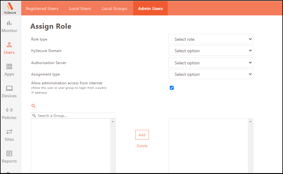 | Administration Over Internet | Displays whether a particular user/user is allowed to access the management console when logged into HySecure over the Internet. |