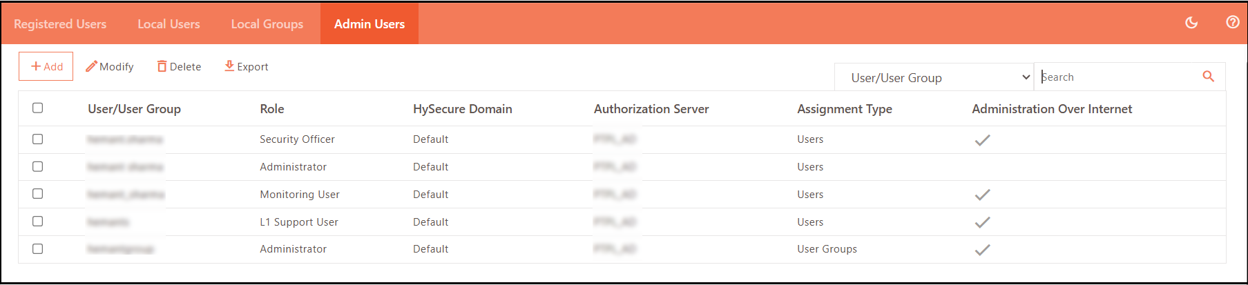 | User/User Group | Displays the user ID /User Group who has the Admin role assigned in HySecure. |