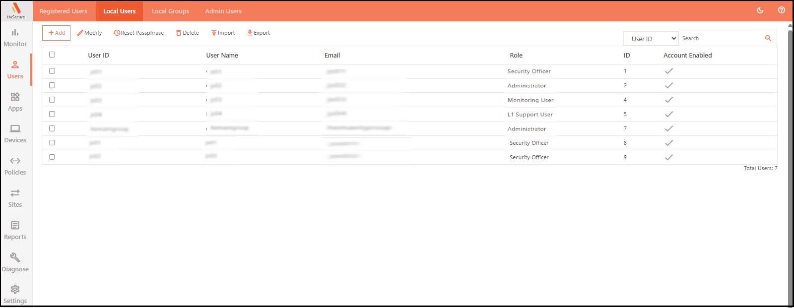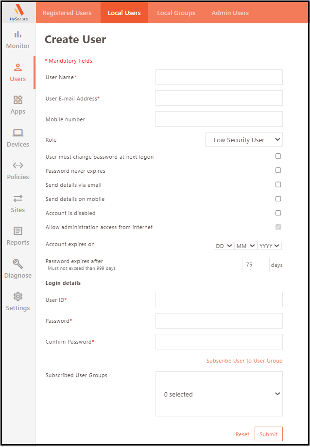 Organizations integrate HySecure with AD/LDAP/SAML - third-party authentication methods for user authentication. However, there are situations where organizations do not have third-party authentication methods or do not wish to use them for internal reasons. In such cases, HySecure supports creating users in its local database. These are called Local Users.