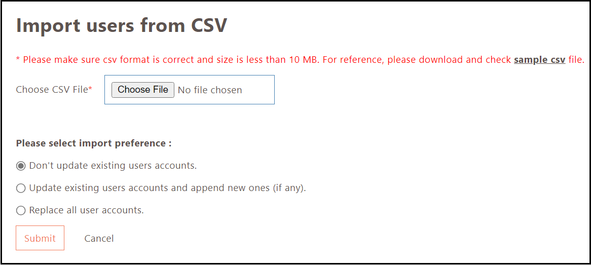 Replace all user accounts: Select this option if all the existing low security users are to be replaced by the users uploaded from the .csv file.