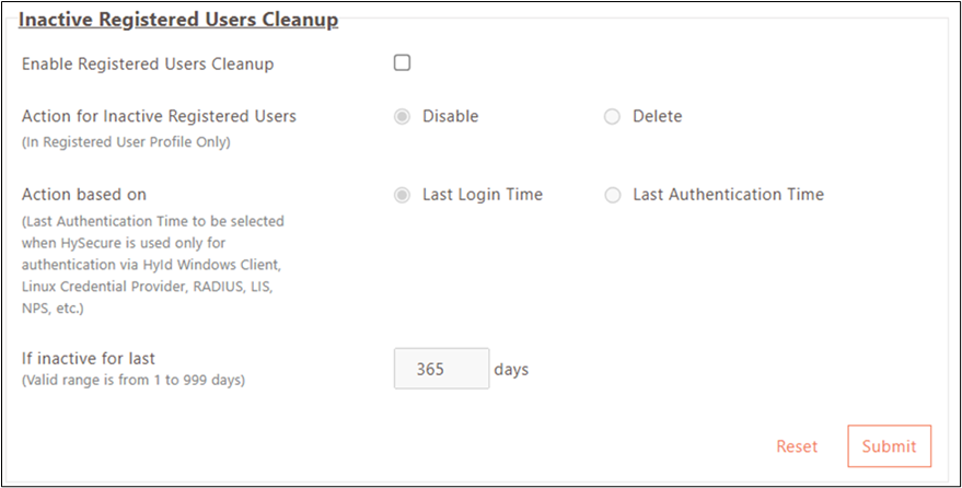 The cleanup process tracks user inactivity based on either last login time (for gateway application access) or last authentication time (for HyID Windows client, Linux Credential Provider, RADIUS, NPS, and third-party MFA integrations), providing flexible criteria to match organizational security policies.