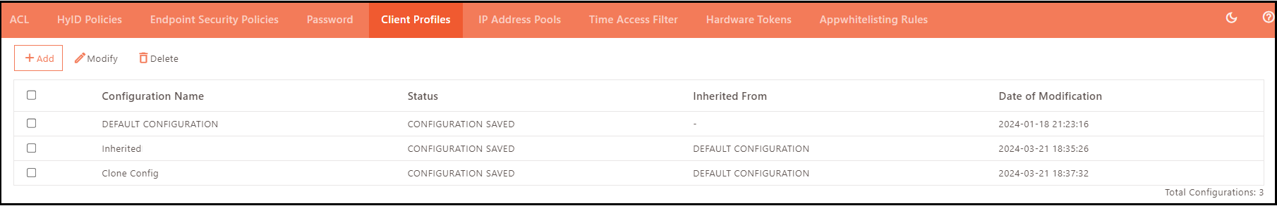 HySecure Gateway allows client settings to be applied for all users at the global level, to set to users, user groups or OU. It is possible to define multiple client setting configurations that can be applied to different subsets of users by defining a new type of ACL called Client Configuration. ACL can be applied to specific users, groups of users, or realms.