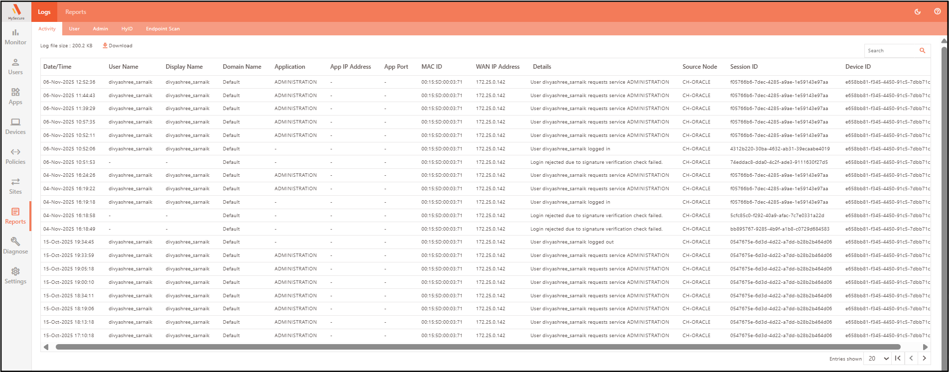| MAC ID | Displays the MAC ID of the interface through which the user has connected. If the user has initiated the activity from a browser, a "-" is displayed. |