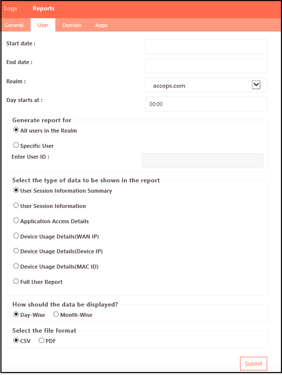 Select the duration and User ID for whom you want to generate the report. The report can be generated for all the users in the Realm i.e. the HySecure Domain.