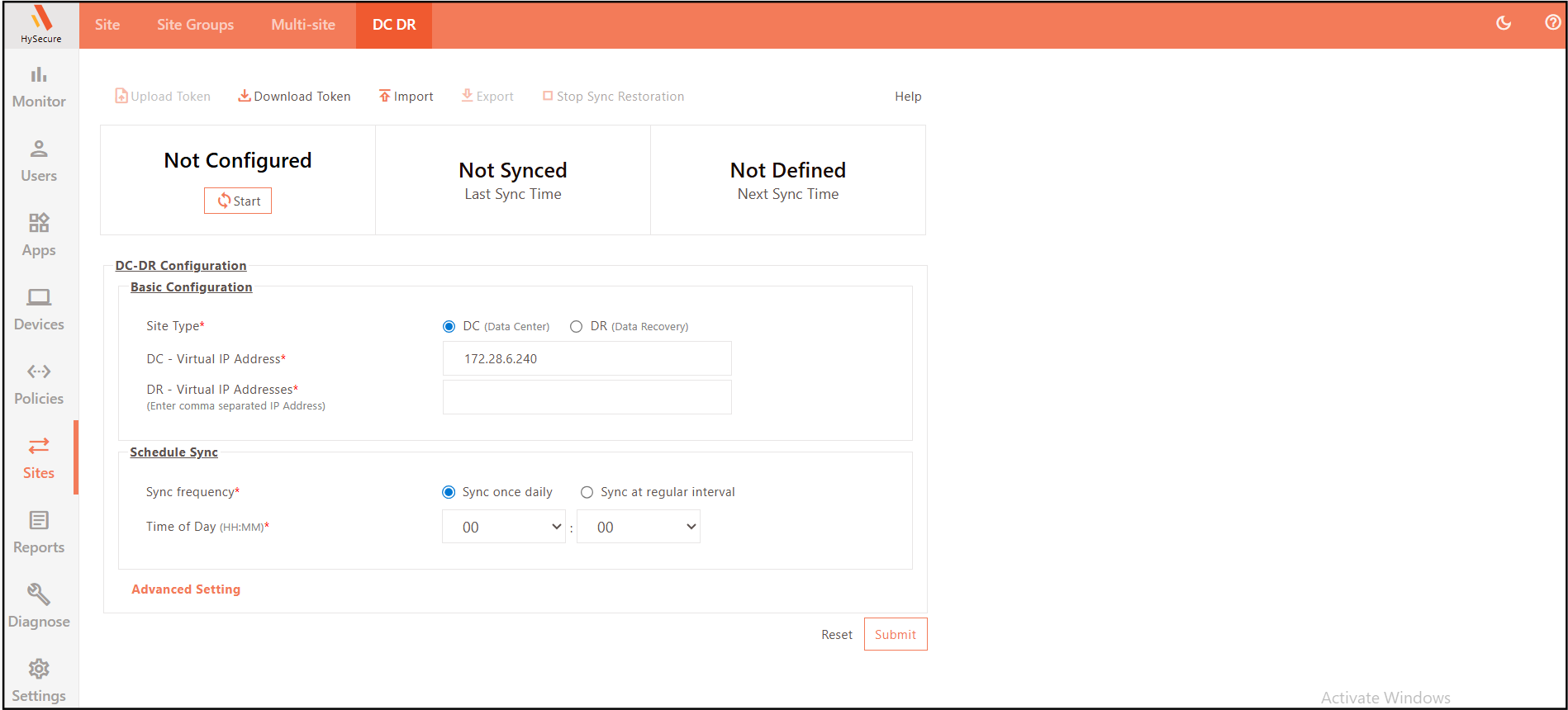 The HySecure DC–DR Sync feature allows administrators to synchronize HySecure user configurations and policies between the DC and DR environments.