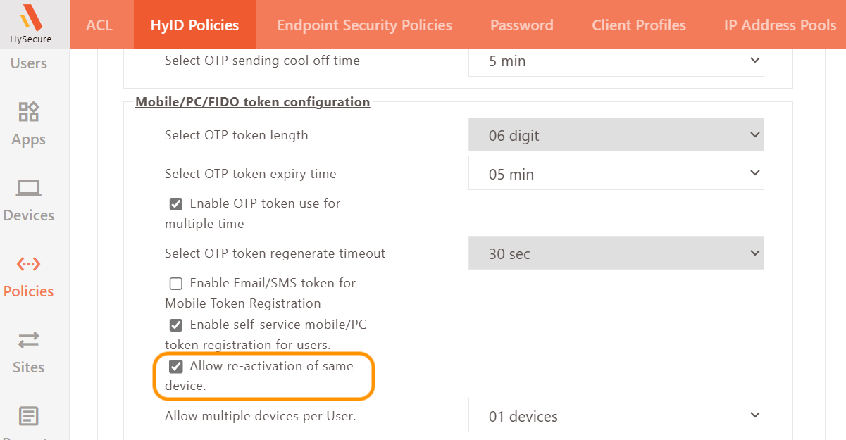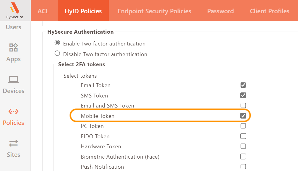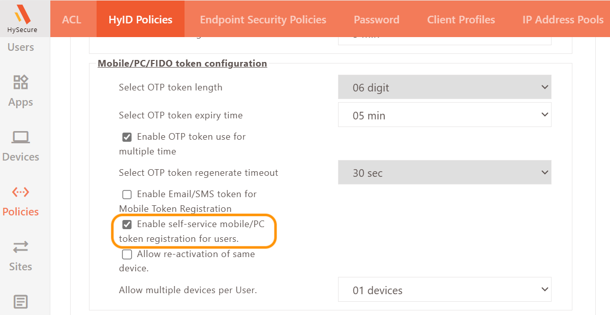 HyID policy must be enabled for the HySecure Gateway user to register the mobile token.