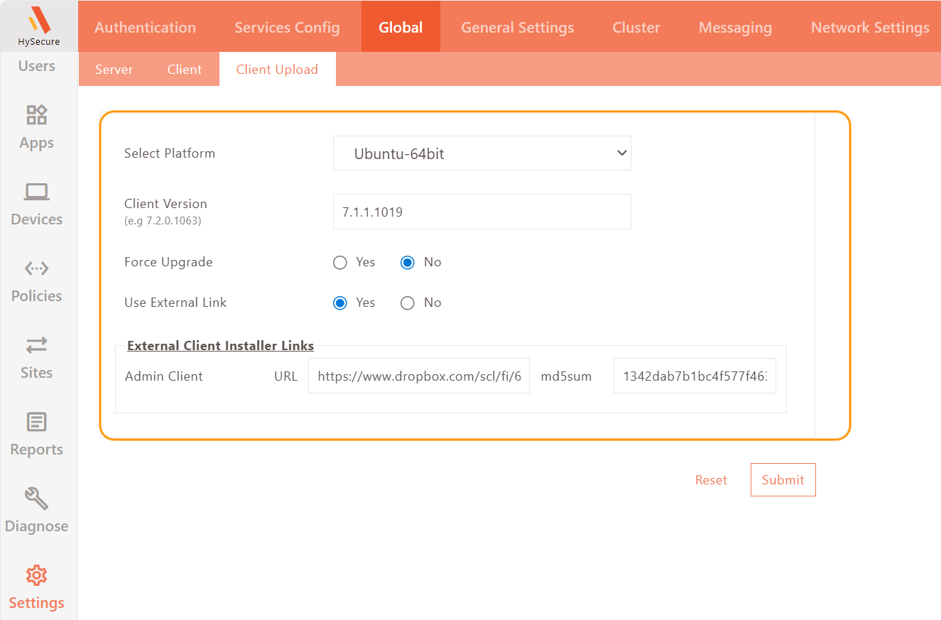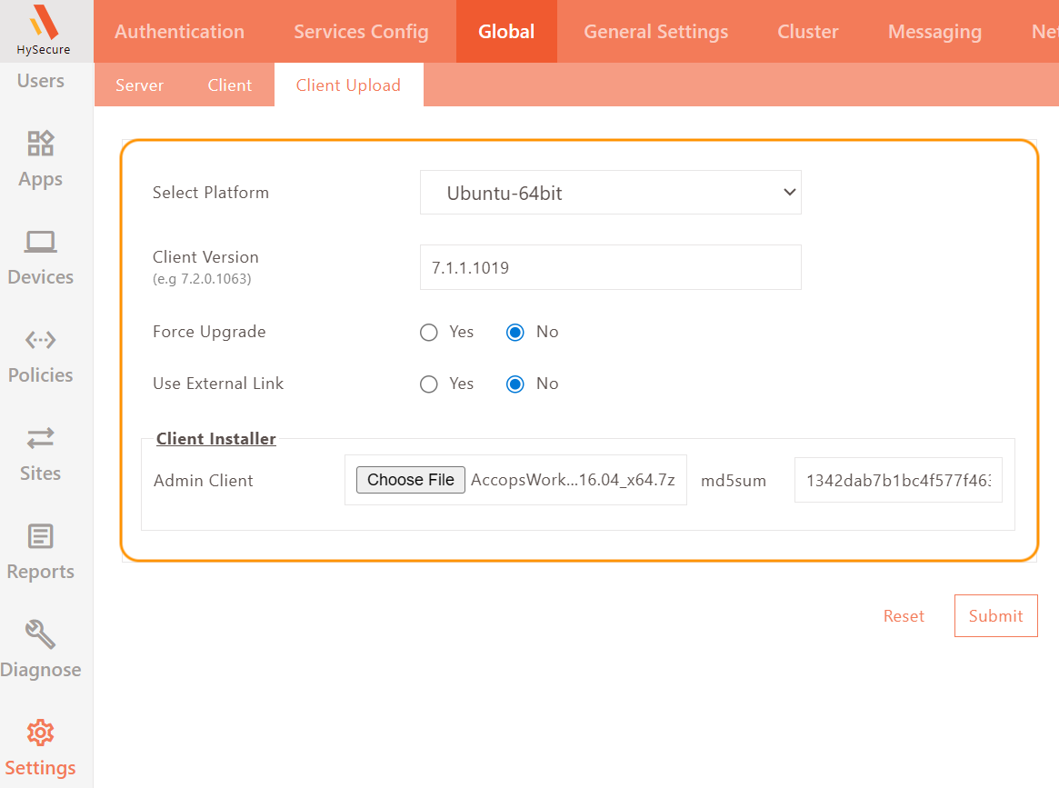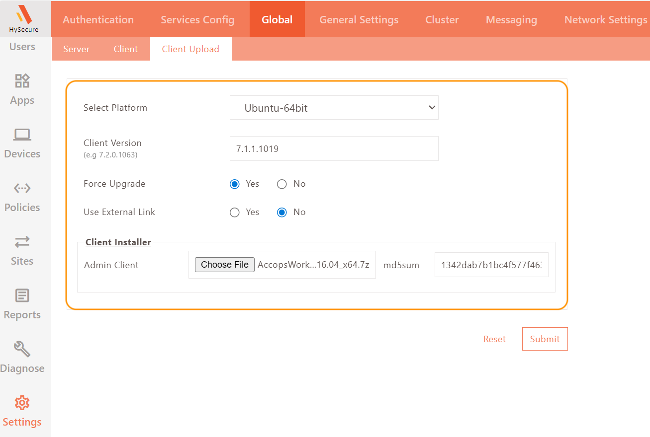 Starting with version 7.2 GA, HySecure Gateway allows administrators to configure client upgrades directly through the management console, removing the need for manual uploads of client installers via the Gateway's backend.