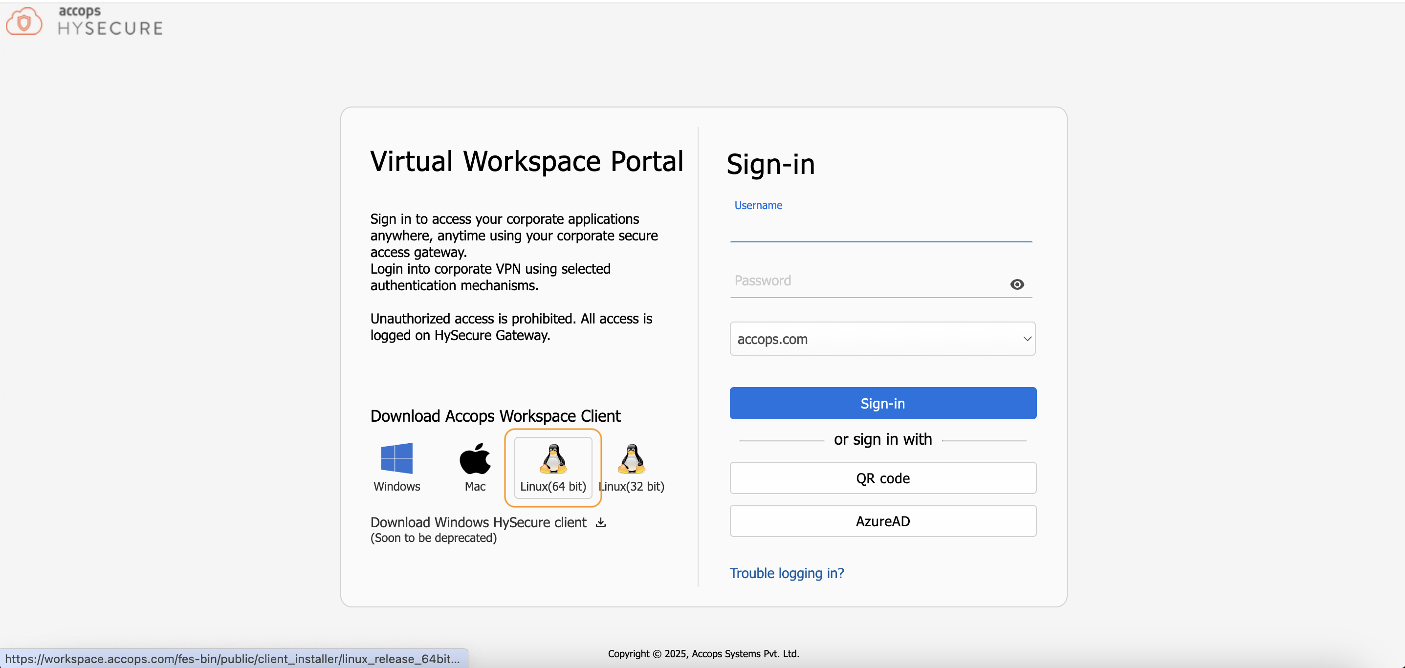 Step 1: In the HyLite portal of the HySecure gateway, locate the section labelled Download Accops Workspace Client and click the Linux (64-bit) icon for Linux.
