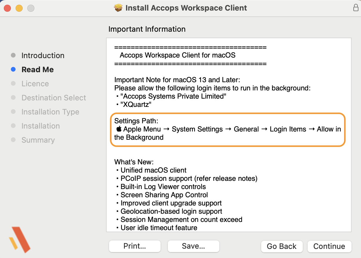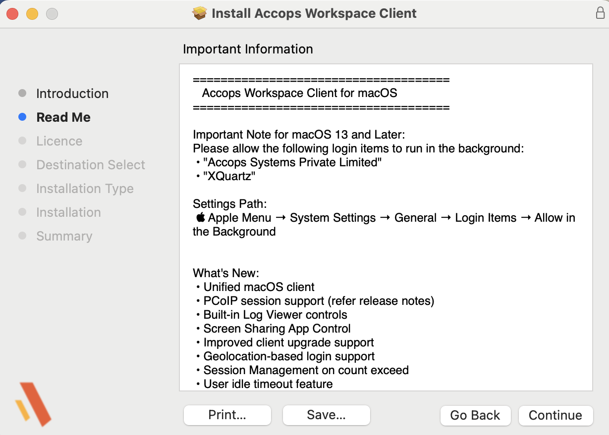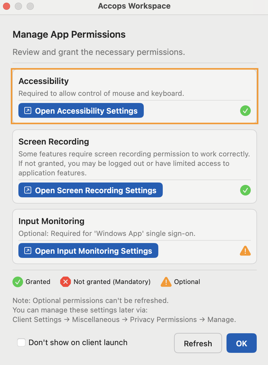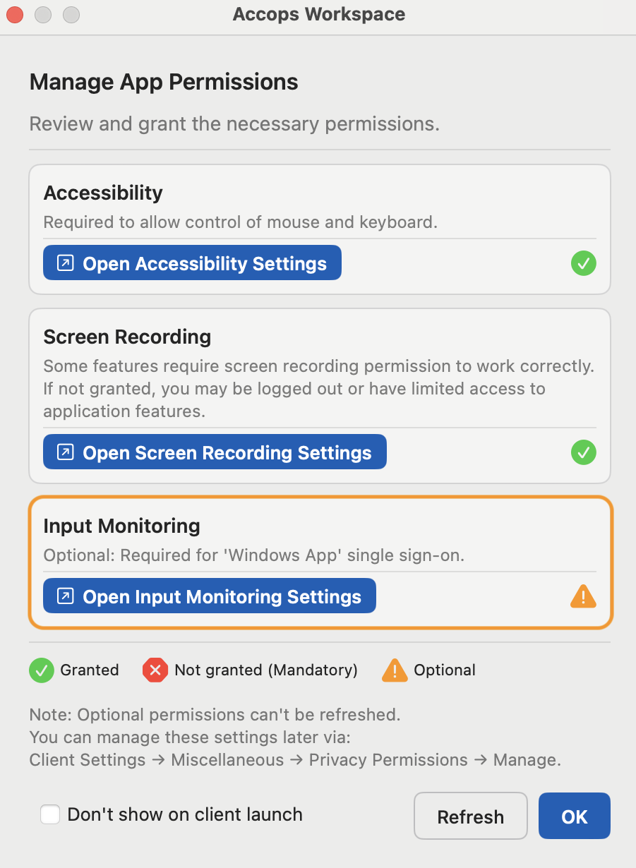 - The Accops Workspace Application must be allowed in both Accessibility and Input Monitoring settings on the user's machine.