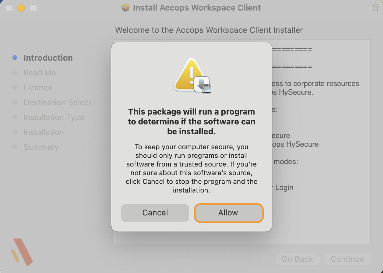 If a message pops up displaying This package will run a program to determine if the software can be installed, then click Allow to continue the installation.