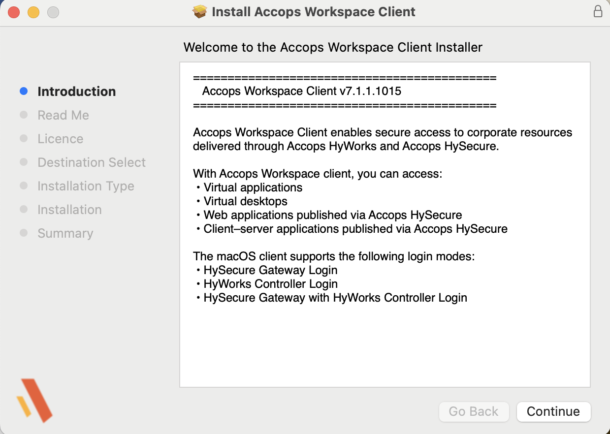 Double-click the Workspace installer.dmg to mount. (e.g. Accops Workspace -7111011.dmg).