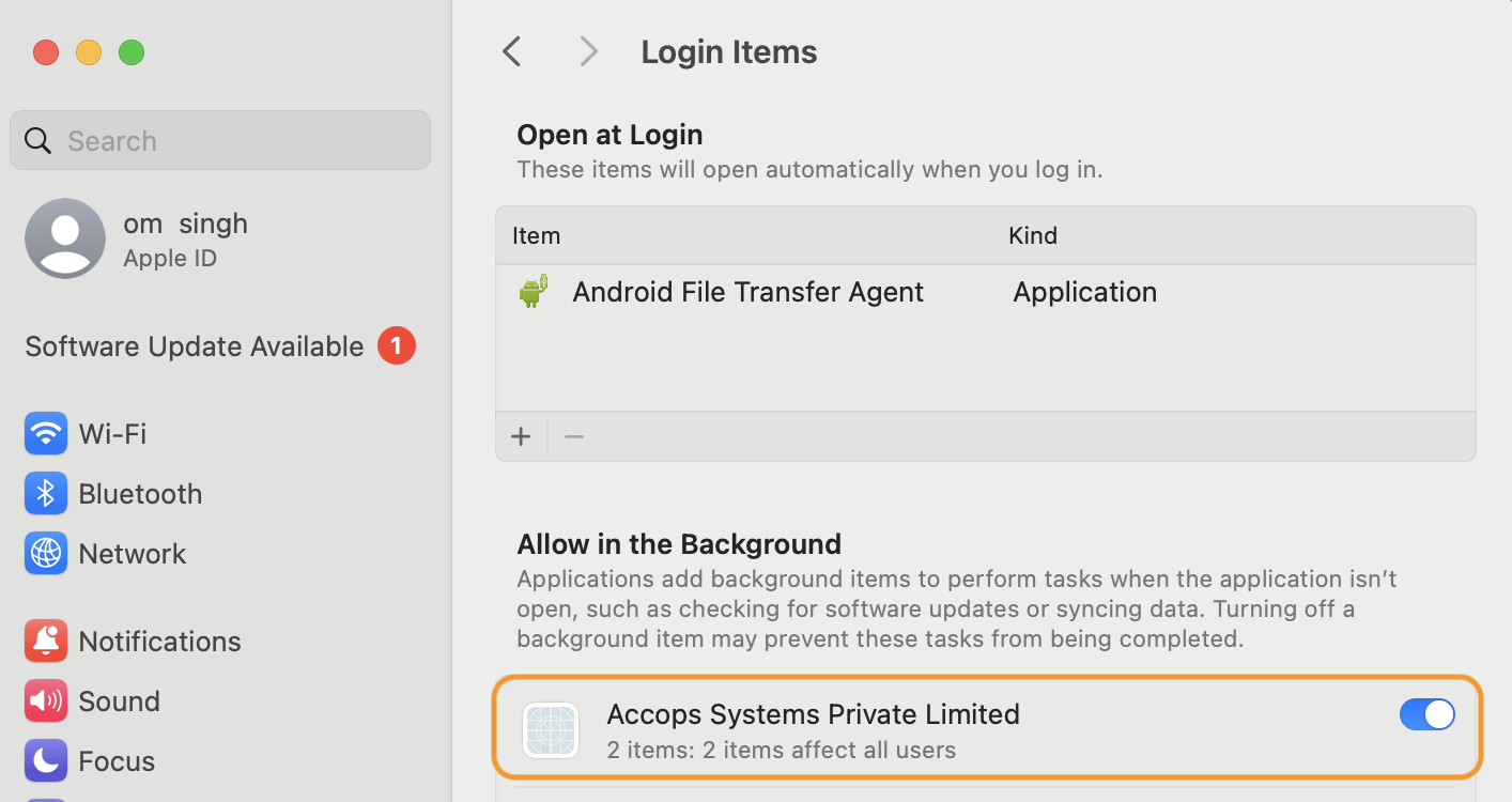- Go to the Apple Icon > System settings > General > Login Items > Allow in background.