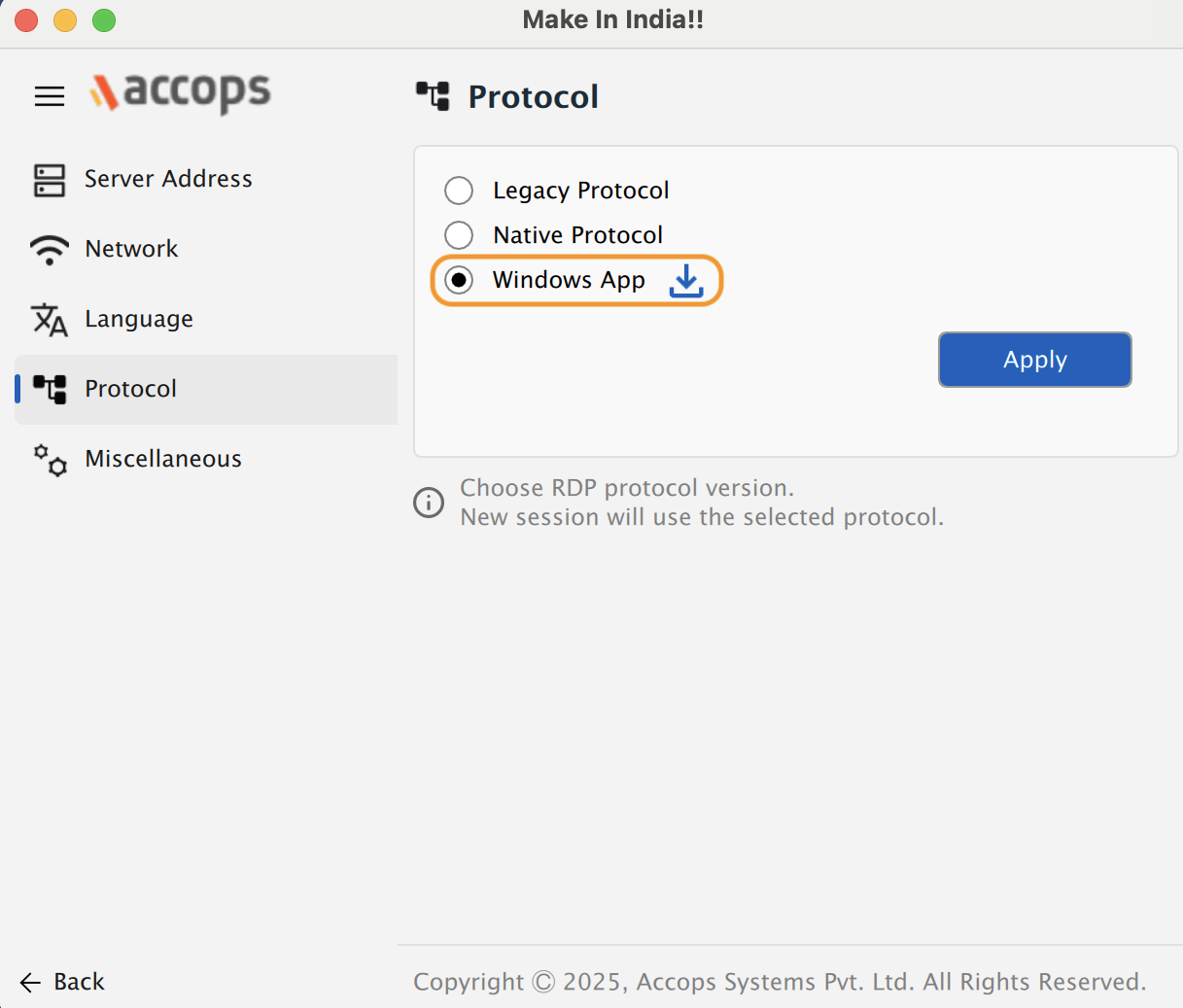 - Alternatively, launch the Workspace Client, navigate to Settings > Protocol, and click on Download to locate the Windows App.