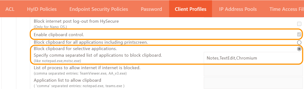 To configure Clipboard Block, simply activate the Enable clipboard control option within the client profile settings.