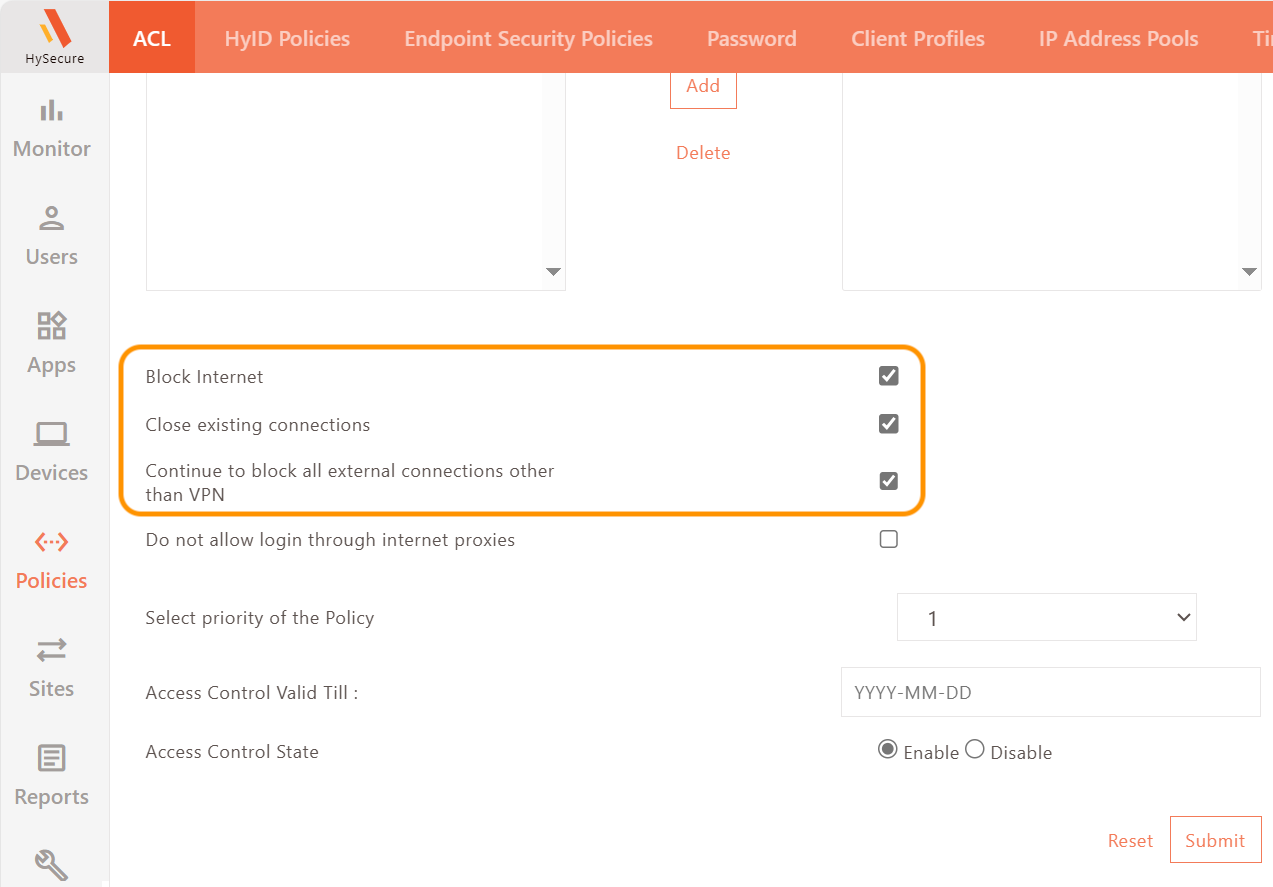 To block Internet access on a Mac endpoint, create an ACL with "Internet block" enabled on the HySecure gateway.