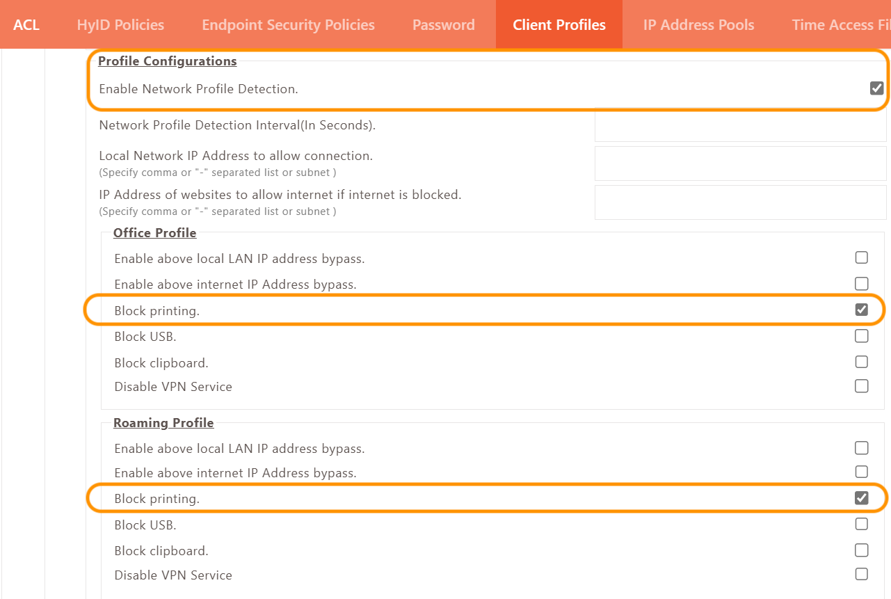 To configure Printing Block, enable Block Printing from the profile configurations of the client profile.