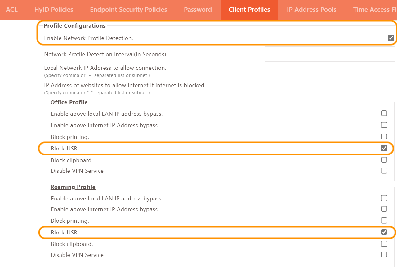 To configure USB Block, enable Block USB in the profile configurations of the client profile.