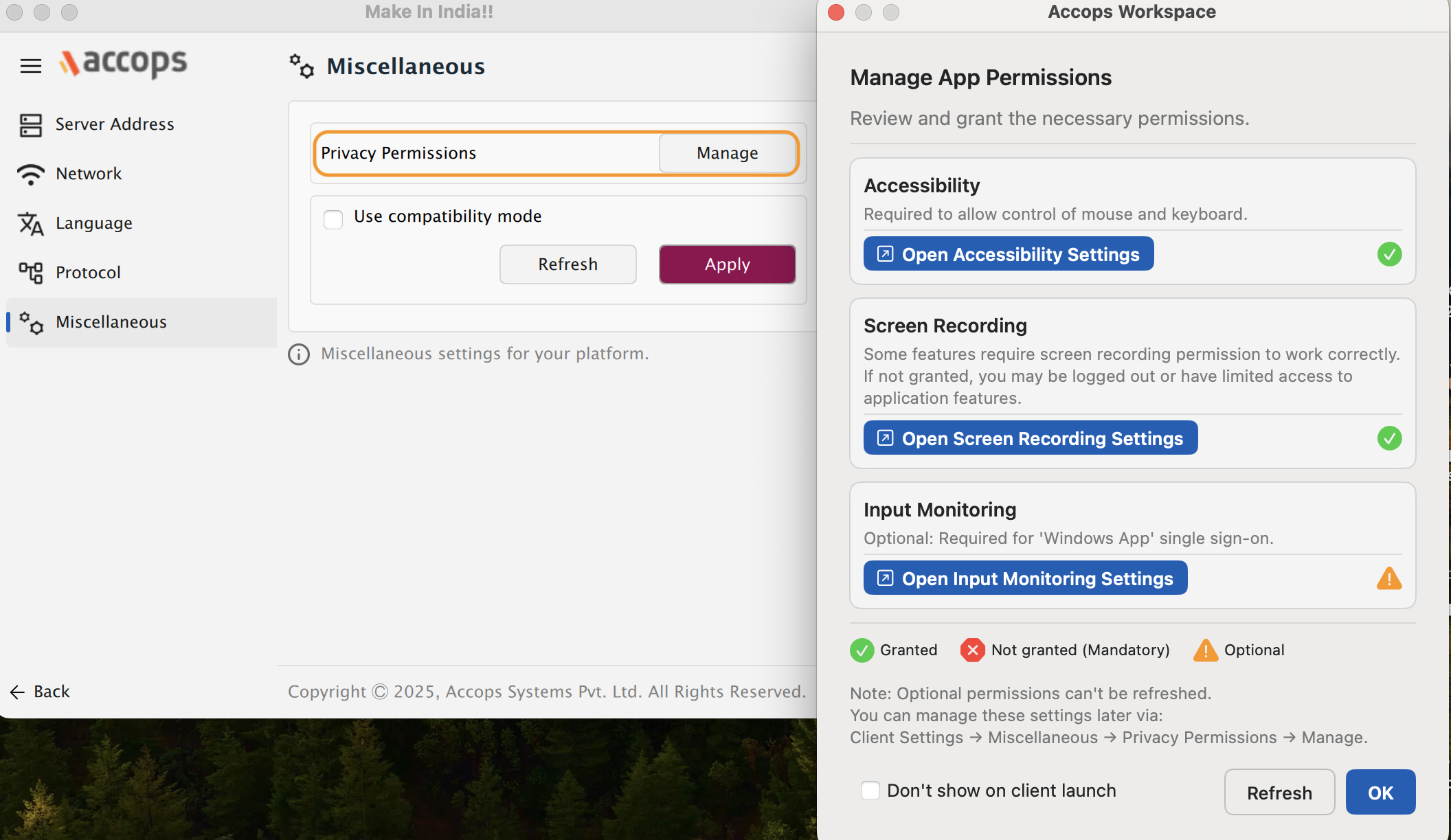 Managing app permissions on a Mac is essential for applications to function properly. For users of the Accops Mac client, specific permissions—such as those needed for Single Sign-On (SSO) integration with Windows applications and enabling the Screen share and recording block feature—are required to ensure seamless and secure operation.