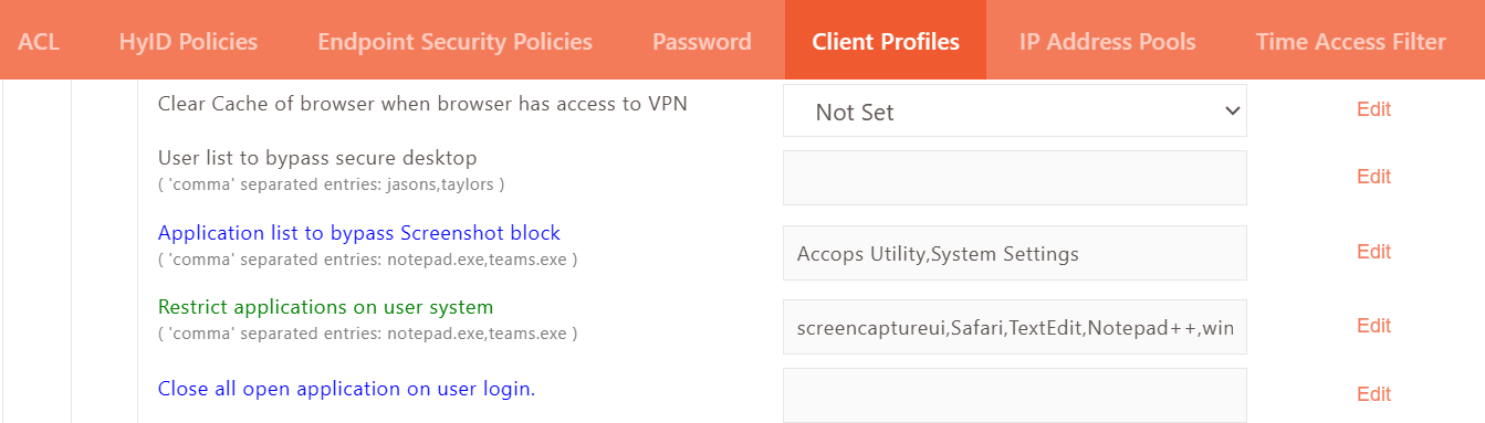 To exclude certain applications from screen sharing, enter their names in the designated field as a comma-separated list. When you need to bypass the log viewer, select Accops Utility. For managing system preferences, go to System Settings.