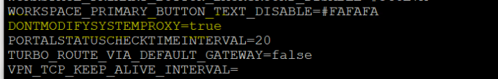| DONTMODIFYSYSTEMPROXY | true | If set to True, Workspace Client will NOT add/change proxy settings or add the app tunnel application list to the proxy override list on the system. |