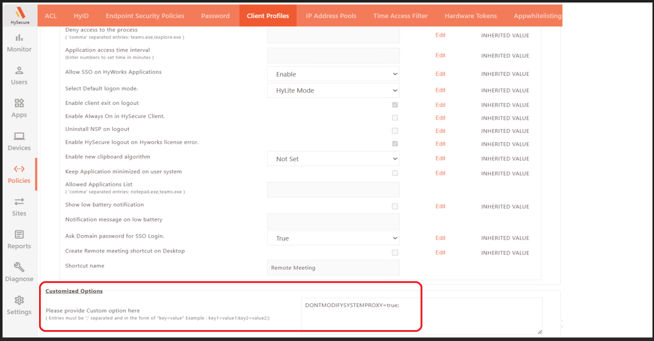 Access HySecure Management Console > Policies > Client Profiles